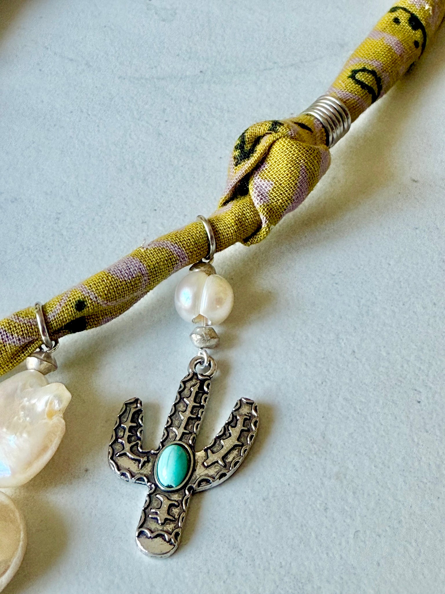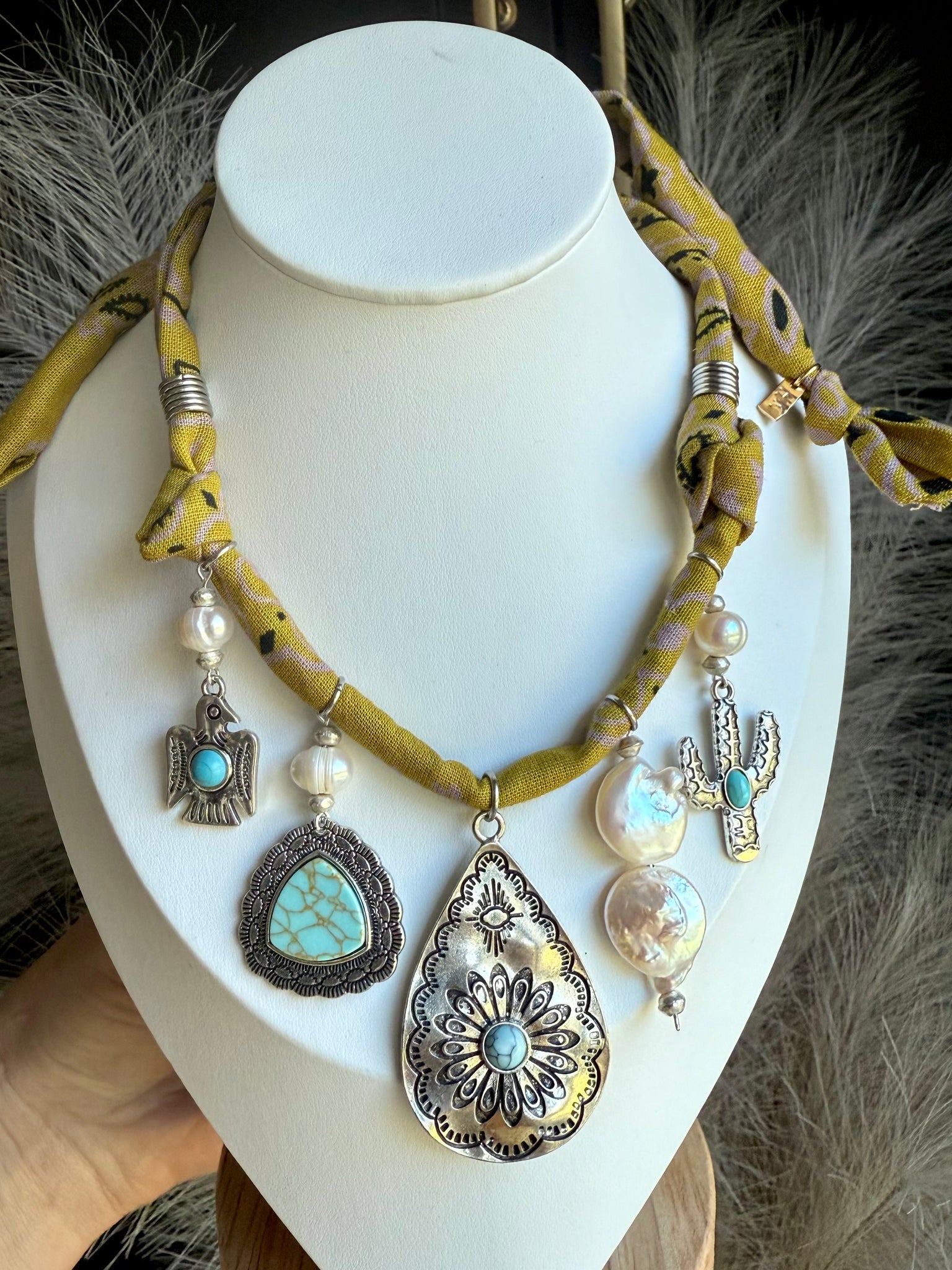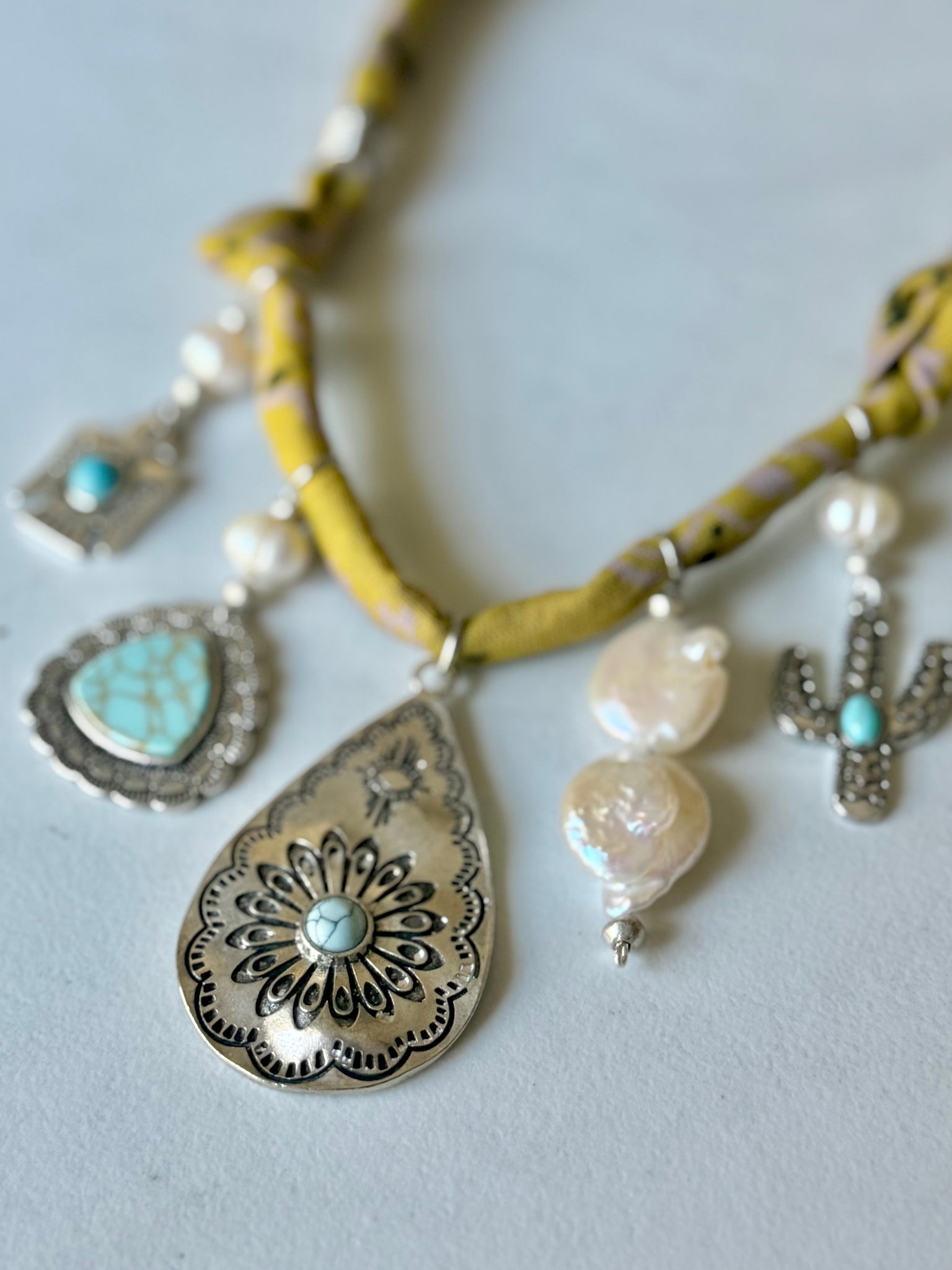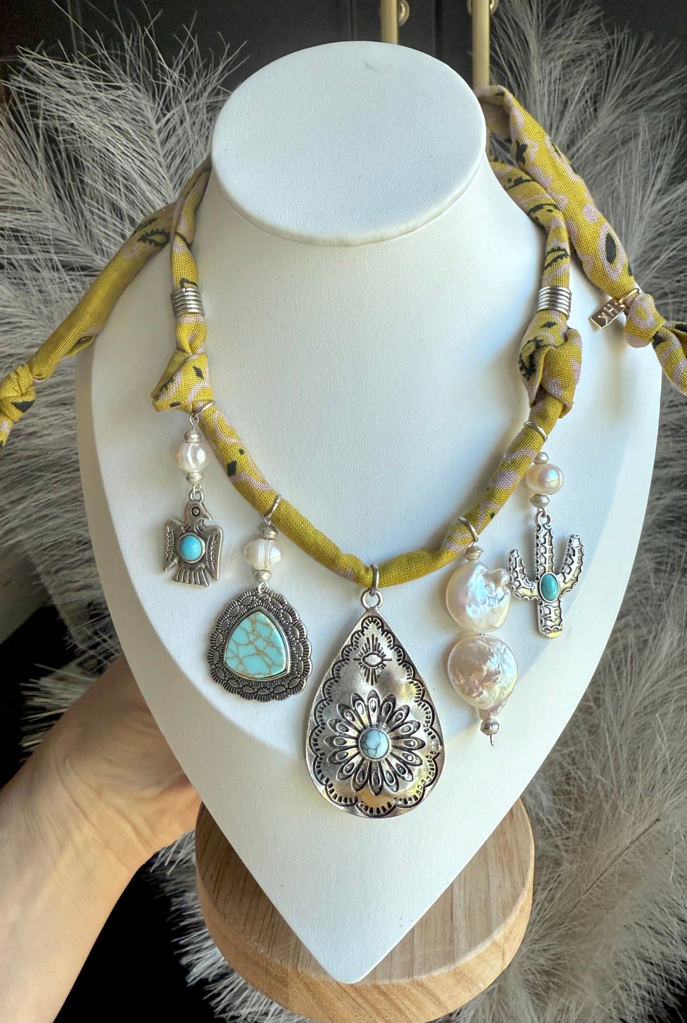 Bandana Necklace - Silver, Turquoise, Pearls & Vintaged Chartreuse Yellow Bandana
