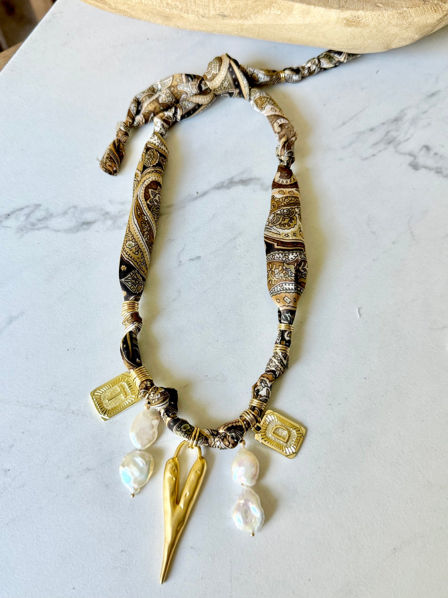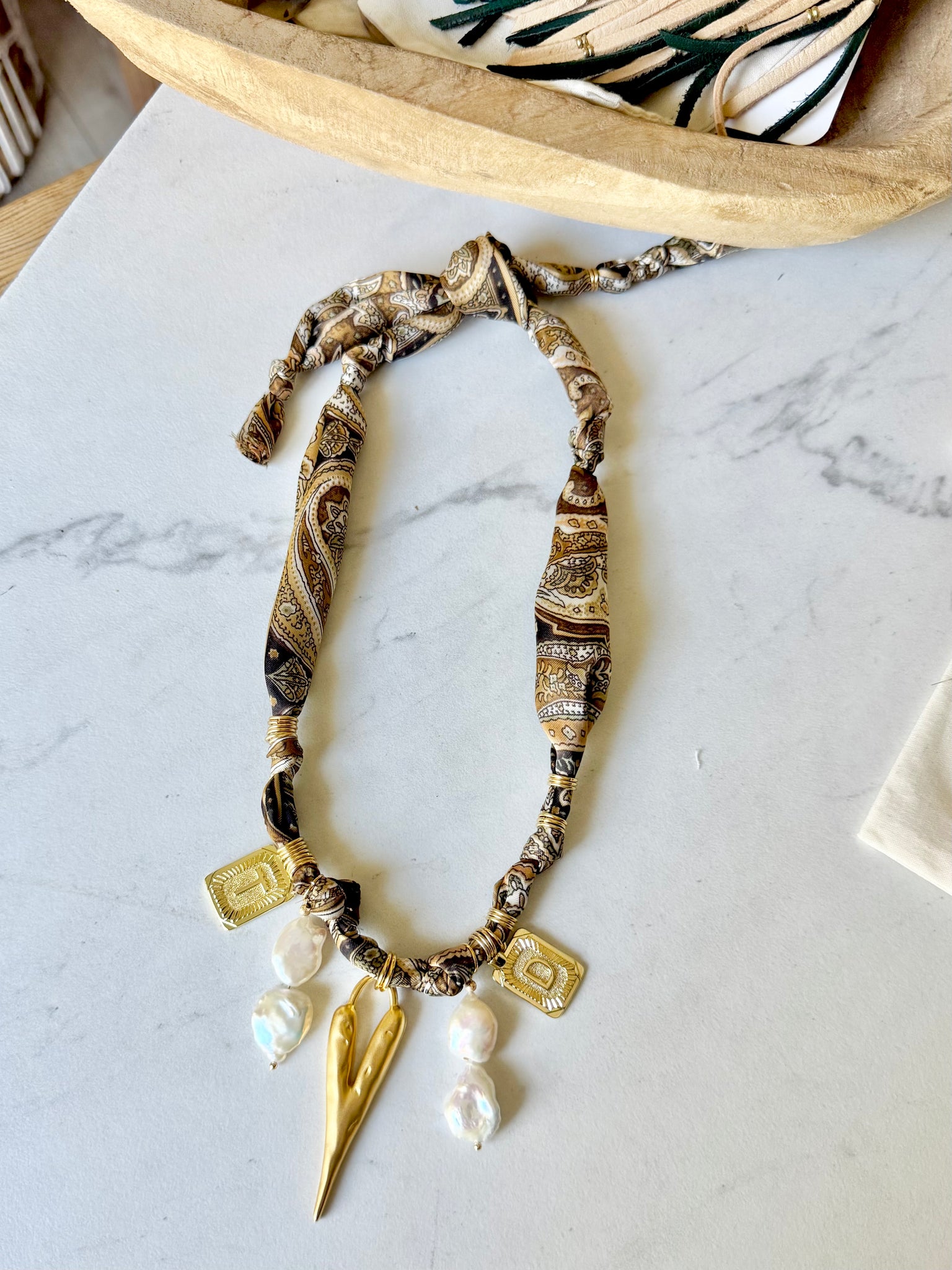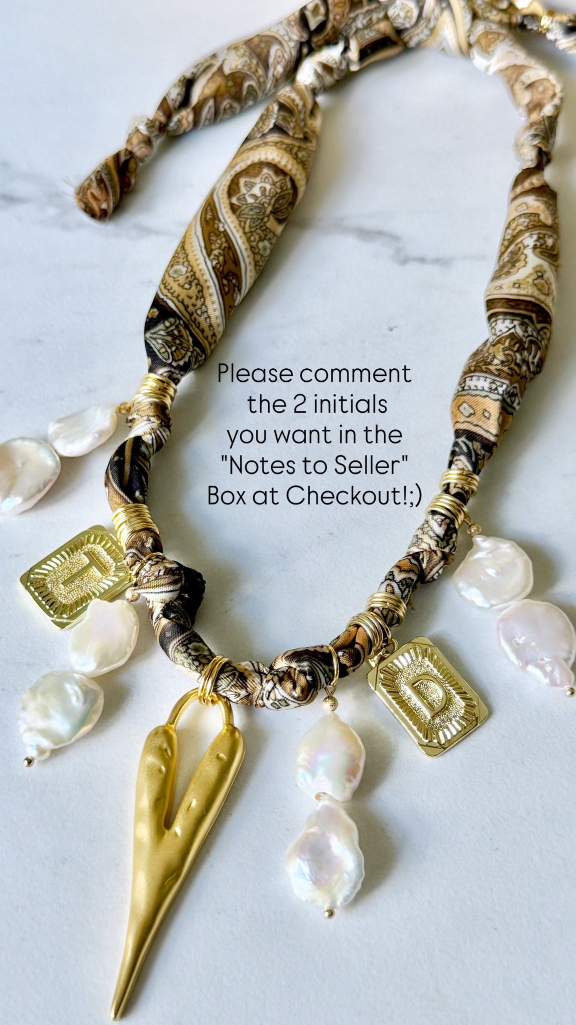 Neutral Browns Bandana with 14k Gold plated Initial Charms, Baroque Pearls & 18k Matte Gold Pendant!