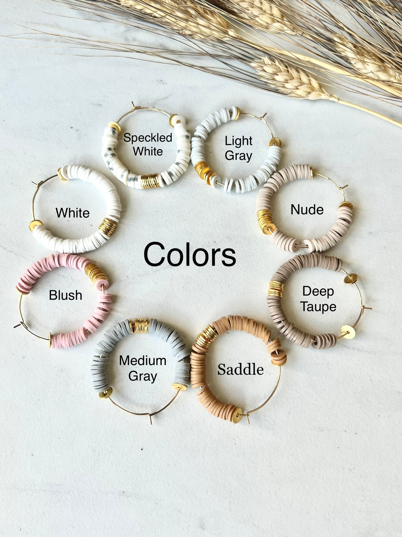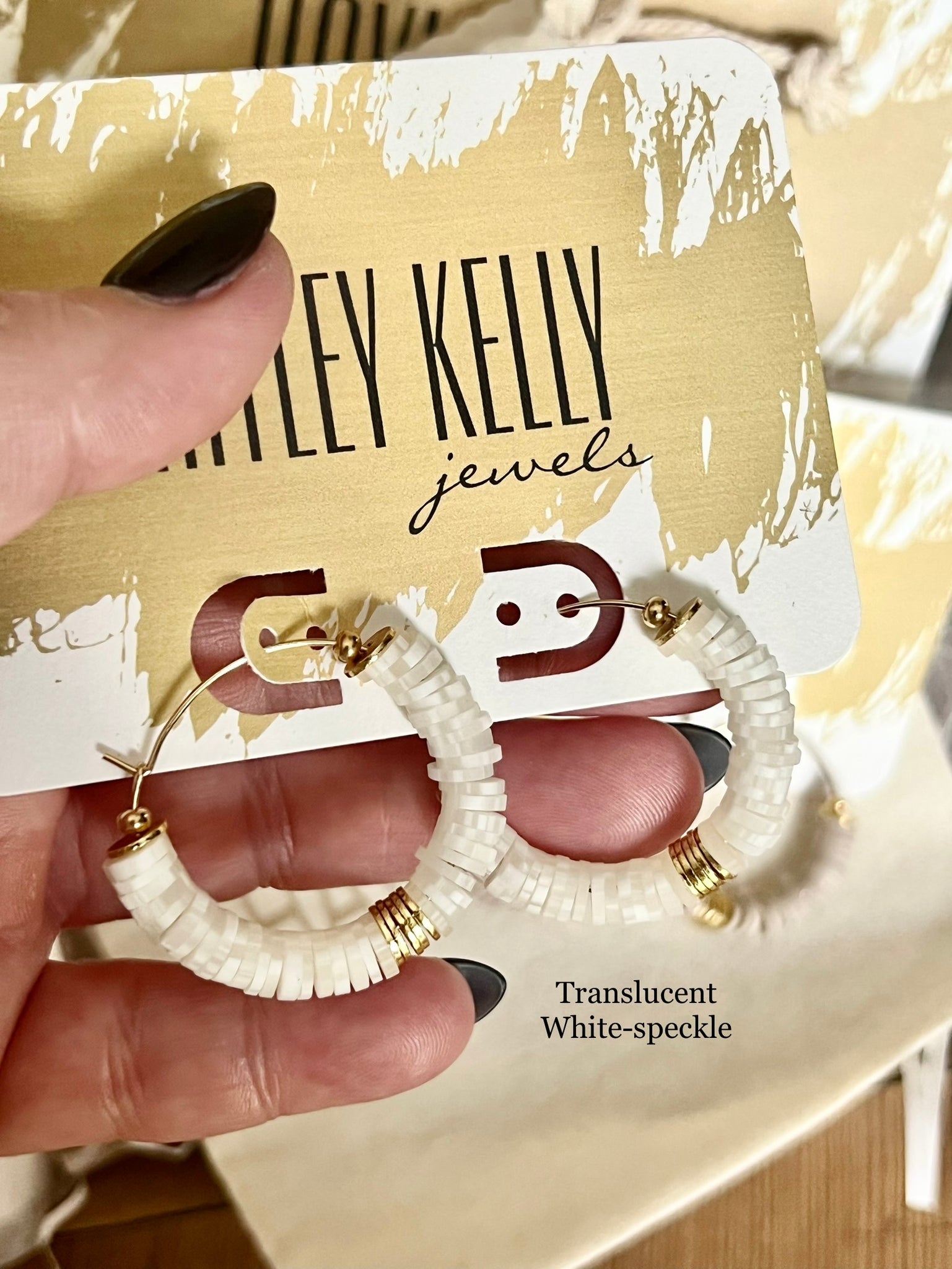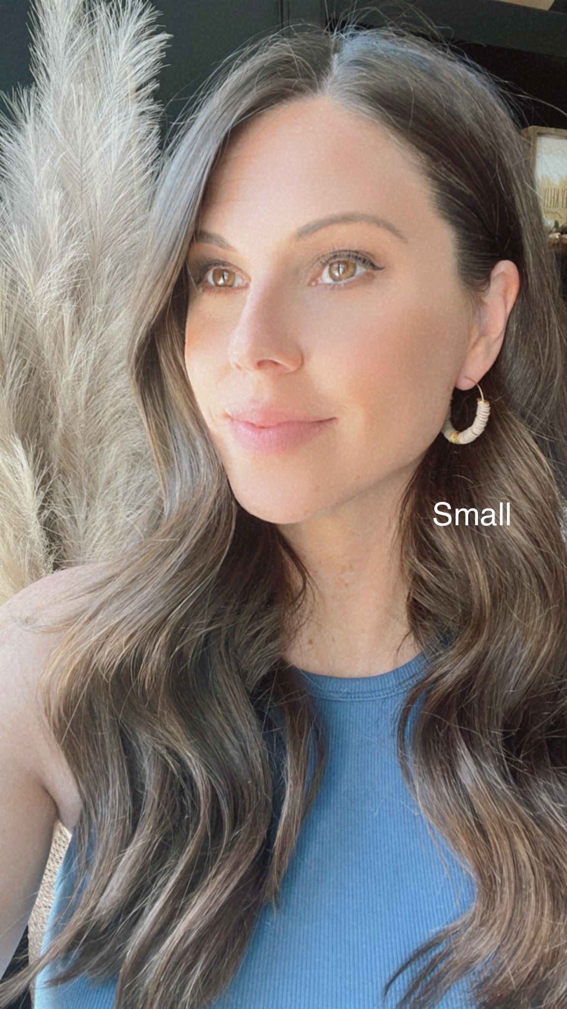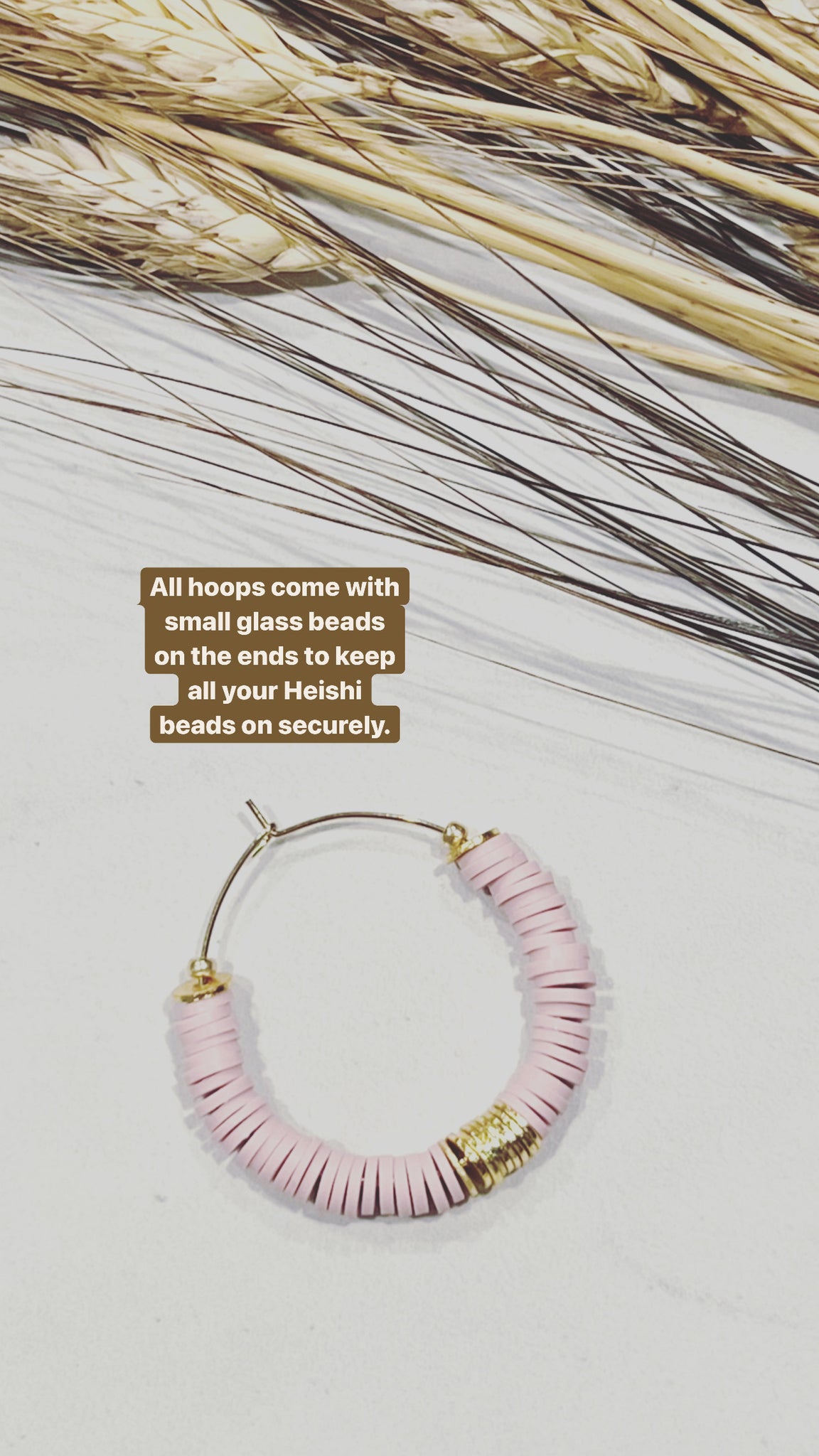 •Glass Gold colored End Beads ( extra secured bead ends so Heishi beads won't fall off of your Hoops!)