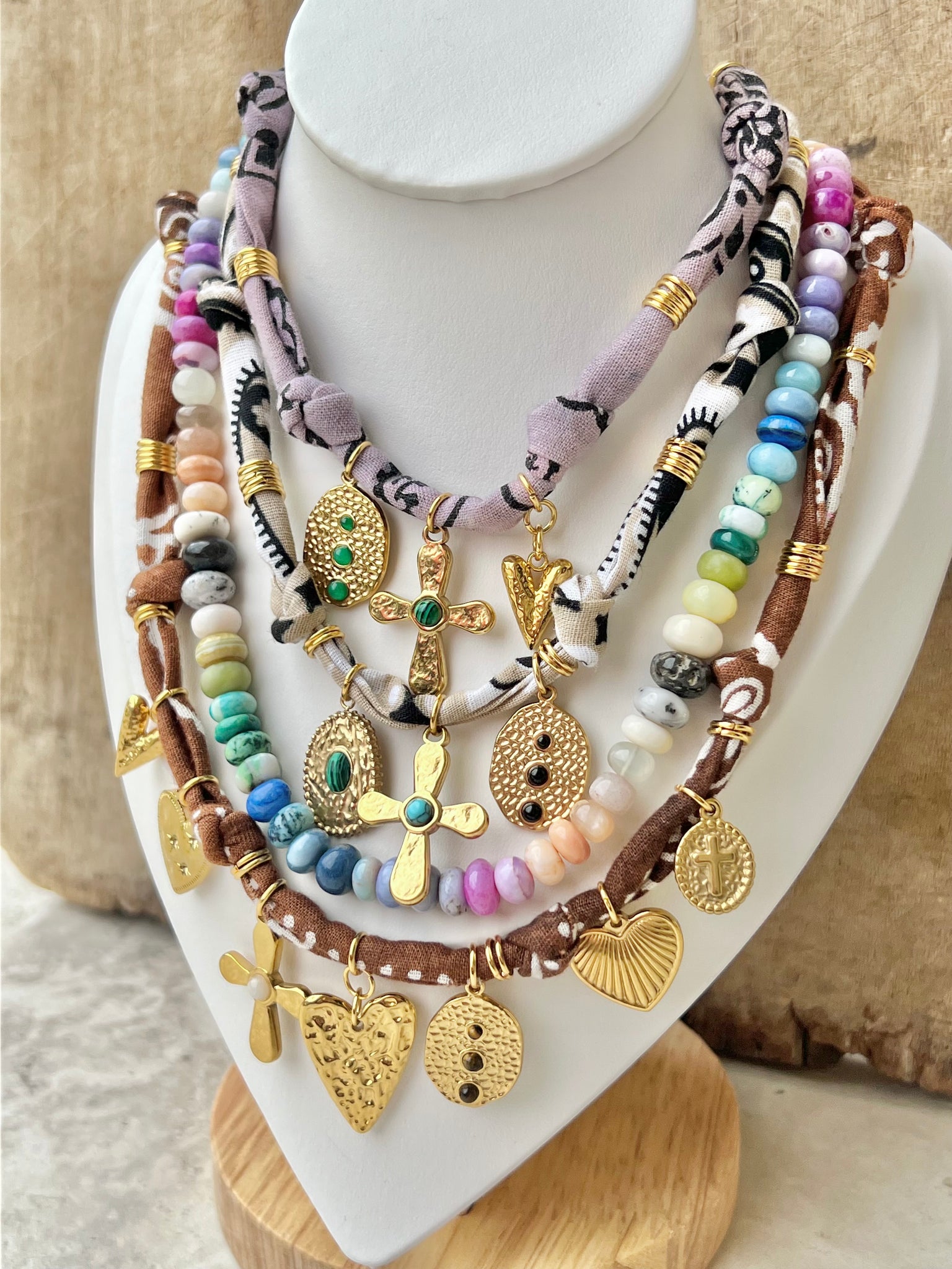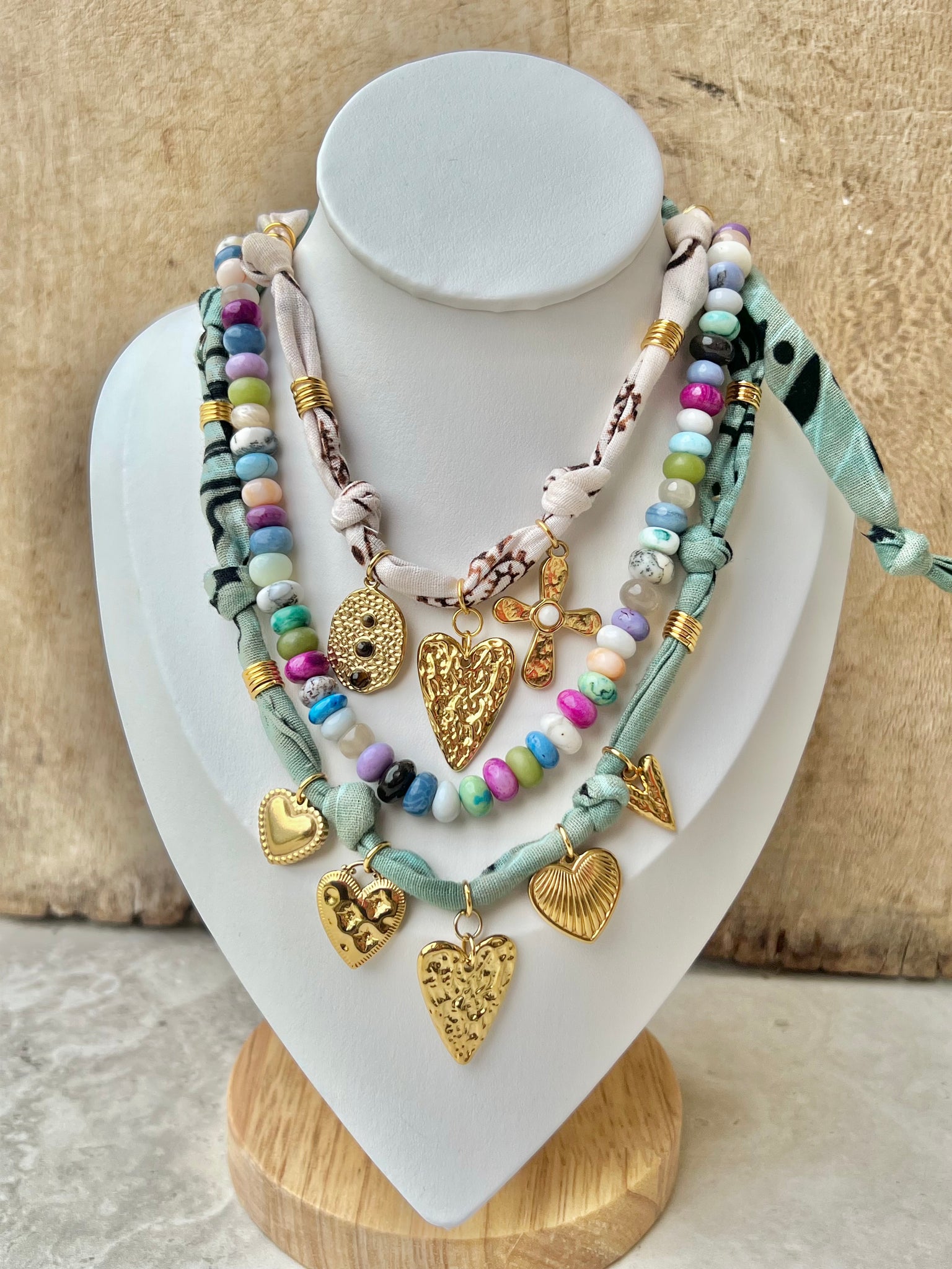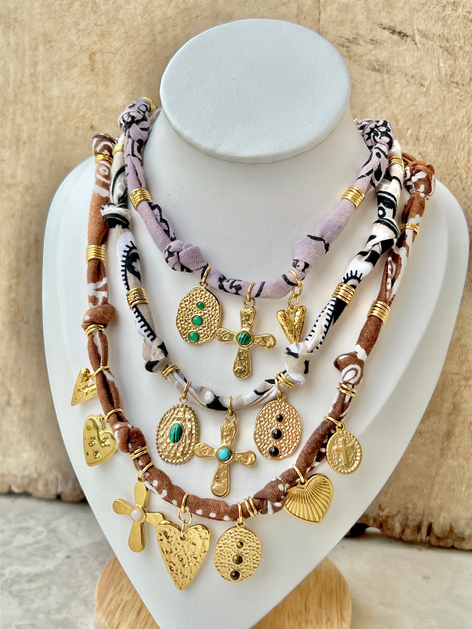 +Hand dyed, Sun Bleached Bandana Necklaces. 100% cotton.